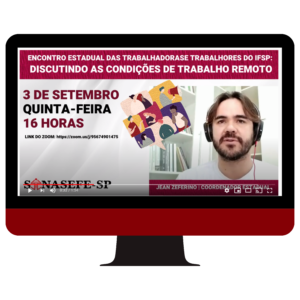 ENCONTRO ESTADUAL ONLINE DAS TRABALHADORAS E TRABALHADORES DO IFSP: DISCUTINDO AS CONDIÇÕES DE TRABALHO REMOTO Confira, no vídeo, o recado do companheiro JEAN ZEFERINO, coordenador estadual do Sinasefe-SP! No encontro, vamos contar com as colaborações do NUGS (Núcleo de Estudos...