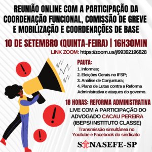 REUNIÃO ONLINE COM A PARTICIPAÇÃO DA COORDENAÇÃO FUNCIONAL, COMISSÃO DE GREVE E MOBILIZAÇÃO E COORDENAÇÕES DE BASE PARTE 1: 🕟 16H30MIN 🚩 Pauta: 1. Informes; 2. Eleições Gerais no IFSP; 3. Análise de Conjuntura; 4. Plano de Lutas contra a Reforma Administrativa e...