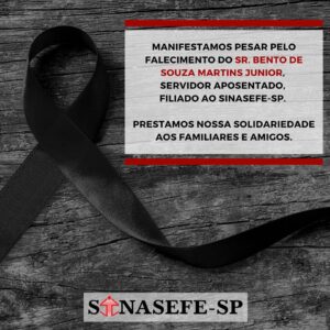 A comunidade acadêmica do Instituto Federal de São Paulo lamenta profundamente o falecimento do Sr. Bento de Souza Martins Junior, servidor aposentado filiado ao Sinasefe-SP. Prestamos nossa solidariedade aos familiares e amigos.
