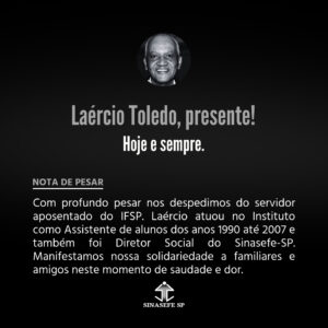 Com pesar nos despedimos do servidor Laércio Toledo, aposentado do IFSP. Manifestamos nossa solidariedade a familiares e amigos neste momento de saudade e dor. Laércio Toledo, presente! Hoje e sempre.