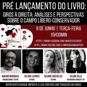 O tema do programa desta terça-feira será o pré-lançamento do livro "Giros à direita: análises e perspectivas sobre o campo líbero-conservador". A transmissão será iniciada às 15h30min no Canal Imprensa Sinasefe-SP do Youtube e também diretamente na página do sindicato...