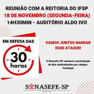 A Reitoria do IFSP convocou uma reunião aberta sobre a minuta da Portaria que trata sobre a questão das 30 horas semanais. O Sinasefe-SP incentivou a participação de todos os trabalhadores, inclusive docentes, para compreendermos a situação e nos...