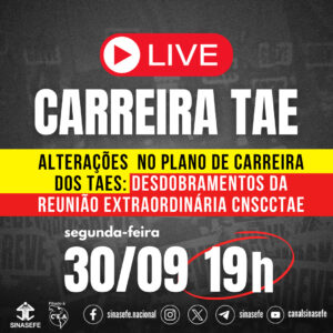 Nesta segunda-feira (30/09), às 19h, o SINASEFE vai realizar uma transmissão ao vivo via Facebook e YouTube. ❗Estarão em pauta as alterações no Plano de Carreira de TAEs, em especial os desdobramentos da Reunião Extraordinária da Comissão Nacional de Supervisão da...