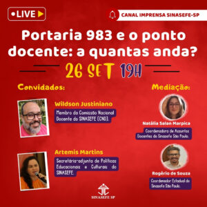 Nesta quinta-feira (26), às 19 horas, o Sinasefe-SP vai promover um bate-papo ao vivo com a professora Artemis Martins (Direção Nacional do Sinasefe) e o professor Wildson Justiniano (CND-Sinasefe). O coordenador estadual da Seção São Paulo Rogério de Souza...