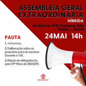 🚨🚩 ASSEMBLEIA GERAL EXTRAORDINÁRIA 🗓️ 24 de MAIO (sexta-feira) ⏱️ 14H (( HÍBRIDA )) | Auditório IVO Campus São Paulo + Plataforma Zoom Pauta: 1. Informes. 2. Deliberação sobre as propostas para as carreiras Docente e TAE. 3. Eleição de delegados/as para...