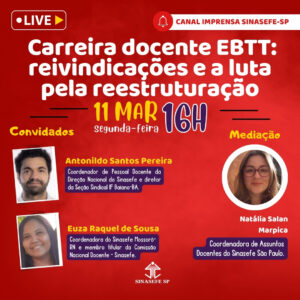 Para conhecer melhor as especificidades da carreira docente EBTT, suas lacunas e demandas, na segunda-feira, 11 de março, às 16 horas, o Sinasefe-SP vai realizar a live Carreira docente EBTT: reivindicações e a luta pela reestruturação, com...