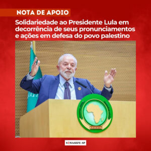 O Sinasefe - Seção São Paulo, vem a público expressar seu apoio e plena solidariedade ao presidente Lula, que tem assumido uma postura corajosa e necessária contra o genocídio do povo Palestino, na Faixa de Gaza.