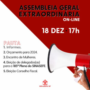 ASSEMBLEIA GERAL EXTRAORDINÁRIA ON-LINE 18 de dezembro (segunda-feira) | 17H Pauta: 1. Informes 2. Orçamento para 2024 3. Encontro de Mulheres 4. Eleição de delegados(as) para a 185ª Plena do SINASEFE (virtual) 5. Eleição Conselho Fiscal COMO PARTICIPAR DA AGE VIRTUALMENTE? Como medida de segurança, o link da...