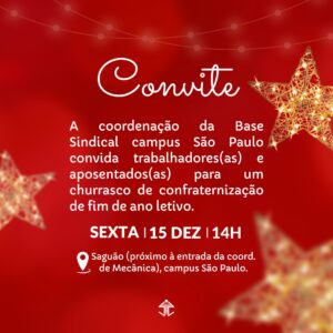 A coordenação da Base Sindical campus São Paulo realizará, nesta sexta (15), a partir das 14 horas, a sua confraternização de fim de ano. Todas e todos estão convidados(as)! O Sinasefe-SP vai ofertar o churrasco, mas pedimos que leve a...