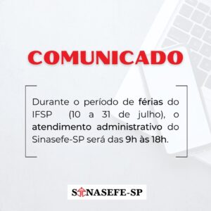 Em virtude do período de férias do IFSP, de 10 a 31 de julho, o atendimento administrativo do Sinasefe-SP será das 9 às 18 horas.