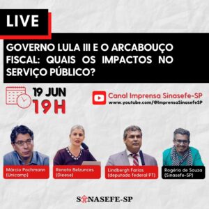 Na segunda-feira (19), às 19h, Márcio Pochmann (Unicamp), Renata Belzunces (Dieese), Lindbergh Farias (deputado federal PT) e Rogério de Souza (Sinasefe-SP) participam de debate ao vivo sobre os impactos do arcabouço fiscal no serviço público. ... Acompanhe a transmissão no