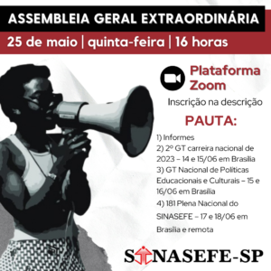 🗓️ 25 de maio (quinta-feira) ⏱️ 16 horas 📌 Plataforma Zoom Pauta: 1) Informes 2) 2º GT carreira nacional de 2023 – 14 e 15/06 em Brasília 3) GT Nacional de Políticas Educacionais e Culturais – 15 e 16/06 em Brasília 4) 181 Plena Nacional do...