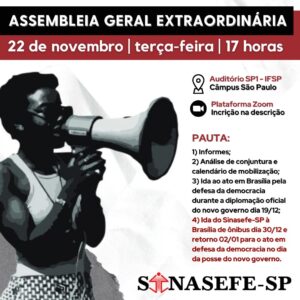 ASSEMBLEIA GERAL EXTRAORDINÁRIA - FORMATO HÍBRIDO - 22 de novembro (terça-feira) - 17 horas Presencial: Auditório SP1 - Câmpus São Paulo IFSP Rua Pedro Vicente, 625 – Canindé – São Paulo/SP Virtual: Plataforma Zoom, mediante inscrição prévia PAUTA: 1) Informes; 2) Análise de conjuntura e calendário de...