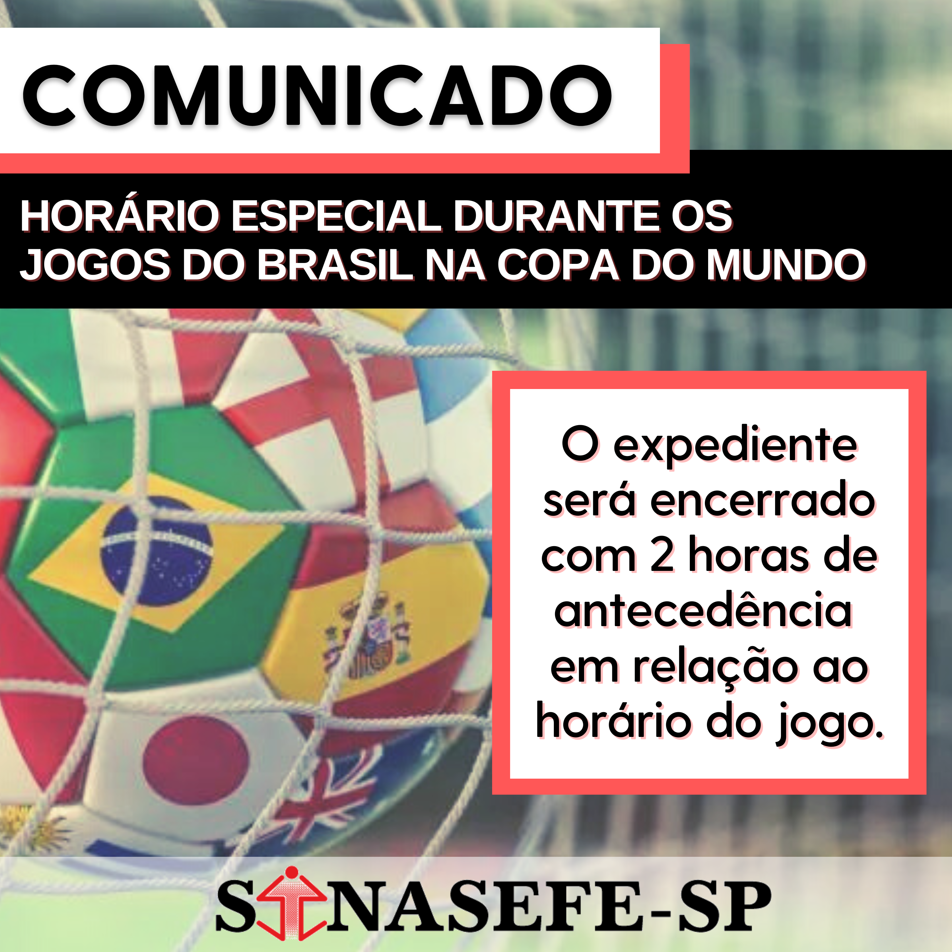 COMUNICADO | HORÁRIO ESPECIAL DURANTE OS JOGOS DO BRASIL NA COPA DO MUNDO O expediente da sede sindical será encerrado com 2 horas de antecedência em relação ao horário das partidas. A seguir, exemplos da fase de grupos: - 24/11 -...
