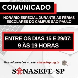 Entre os dias 15 e 29 de junho, o setor administrativo do Sinasefe-SP funcionará entre 9 e 19 horas para atendimento presencial. Após o período das férias escolares do Câmpus São Paulo, o atendimento da sede sindical retornará ao horário...