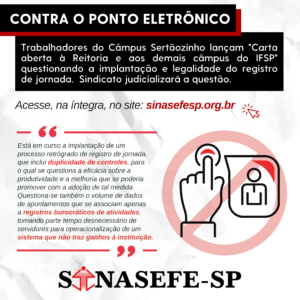 IN 08/2022-IFSP (CONTROLE DE PONTO) | Trabalhadores do Câmpus Sertãozinho lançam "Carta aberta à Reitoria e aos demais câmpus do IFSP" questionando a implantação e legalidade do registro de jornada, que inclui duplicidade de controles. O sindicato...