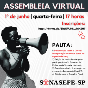 🚨📢 ASSEMBLEIA GERAL EXTRAORDINÁRIA (AGE) VIRTUAL 🗓️ 1º DE JUNHO (quarta-feira) 🕓 17 HORAS 🚩 PAUTA: 1) Deliberação sobre a Greve - incorporação de novas datas na agenda de luta; 2) Eleição de sindicalizadas para participação no 3° Encontro de Mulheres do Sinasefe Nacional; 3)...