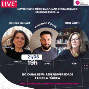 LIVE: Novo Ensino Médio em São Paulo: mais desigualdade e nehuma escolha 21 de junho (terça-feira)19 horasTrasmissão e Organização: REPU e Sinasefe-SP Convidados: Ana Corti (IFSP), Débora Goulart (Unifesp) e Fernando...