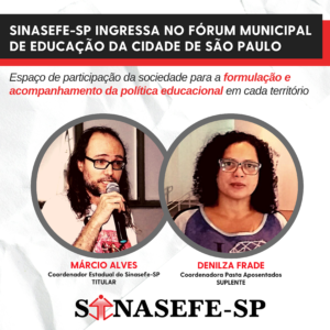 Os companheiros Márcio Alves (Coordenador Estadual) e Denilza Frade (Coordenadora de Aposentados) representarão o Sinasefe-SP, ao lado de entidades e movimentos, na construção coletiva do Fórum Municipal de Educação da cidade de São Paulo, em especial, no ano de...