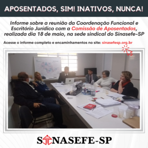 APOSENTADOS, SIM! INATIVOS, NUNCA! Na tarde da última quarta-feira, dia 18 de maio, a Comissão de Aposentados foi recebida na sede sindical para uma reunião com a Coordenação Funcional e o Escritório Jurídico. Estiveram presentes pela Comissão de Aposentados: Alberto...