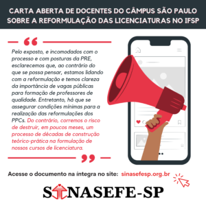 Carta aberta de docentes do Câmpus São Paulo sobre a reformulação das Licenciaturas no IFSP Diante do prazo curto e algumas incongruências no processo de reformulação dos cursos do Instituto Federal de São Paulo, integrantes dos NDEs dos cursos de...