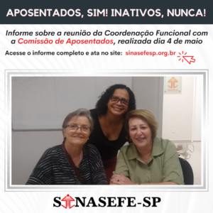 APOSENTADOS, SIM! INATIVOS, NUNCA! Na última quarta-feira, dia 4 de maio, a Coordenação Funcional do Sinasefe-SP, representada pelas companheiras Denilza Frade e Elaine Cristina dos Santos, reuniu-se com uma Comissão de Aposentados representada pelos filiados: Vera Mergulhão, Sônia Zorzi e...