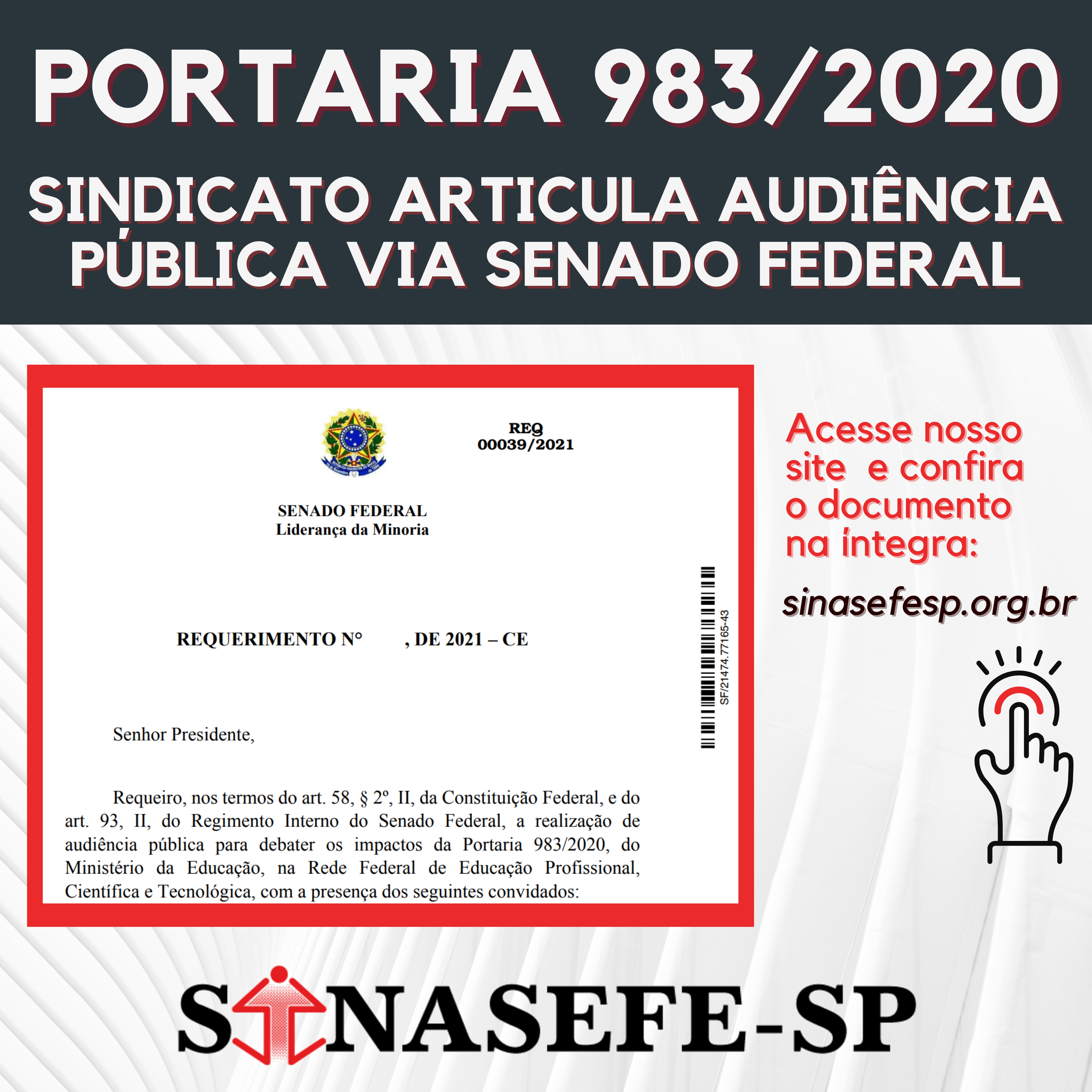A partir da intermediação do Sinasefe-SP em conjunto com o Sinasefe Nacional, a liderança do Partido dos Trabalhadores (PT) solicitou a realização de uma Audiência Pública para discutir e sustar os efeitos da Portaria MEC n. 983 de 18...