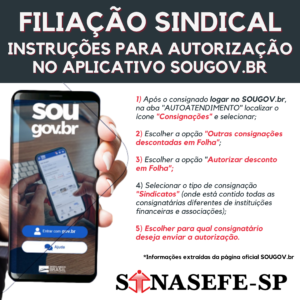 FILIAÇÃO SINDICAL | INSTRUÇÕES PARA AUTORIZAÇÃO NO APLICATIVO SOUGOV.br Novas filiações sindicais devem seguir o seguinte passo-a-passo: 1) Após o consignado logar no SOUGOV.br, na aba "AUTOATENDIMENTO" localizar o ícone "Consignações" e selecionar; 2) Escolher a opção "Outras consignações descontadas em Folha"; 3)...
