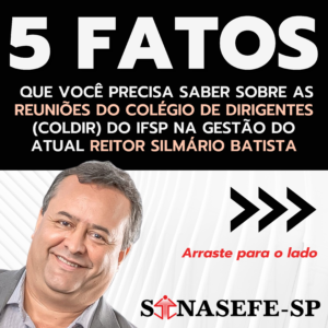 EXIGIMOS TRANSPARÊNCIA NO IFSP! Sinasefe-SP demonstra 5 FATOS que a comunidade acadêmica precisa tomar conhecimento sobre as reuniões do Colégio de Dirigentes (COLDIR) na gestão do atual reitor Silmário Batista. Confira! FATO 1 - O COLDIR, que é meramente consultivo, tem...