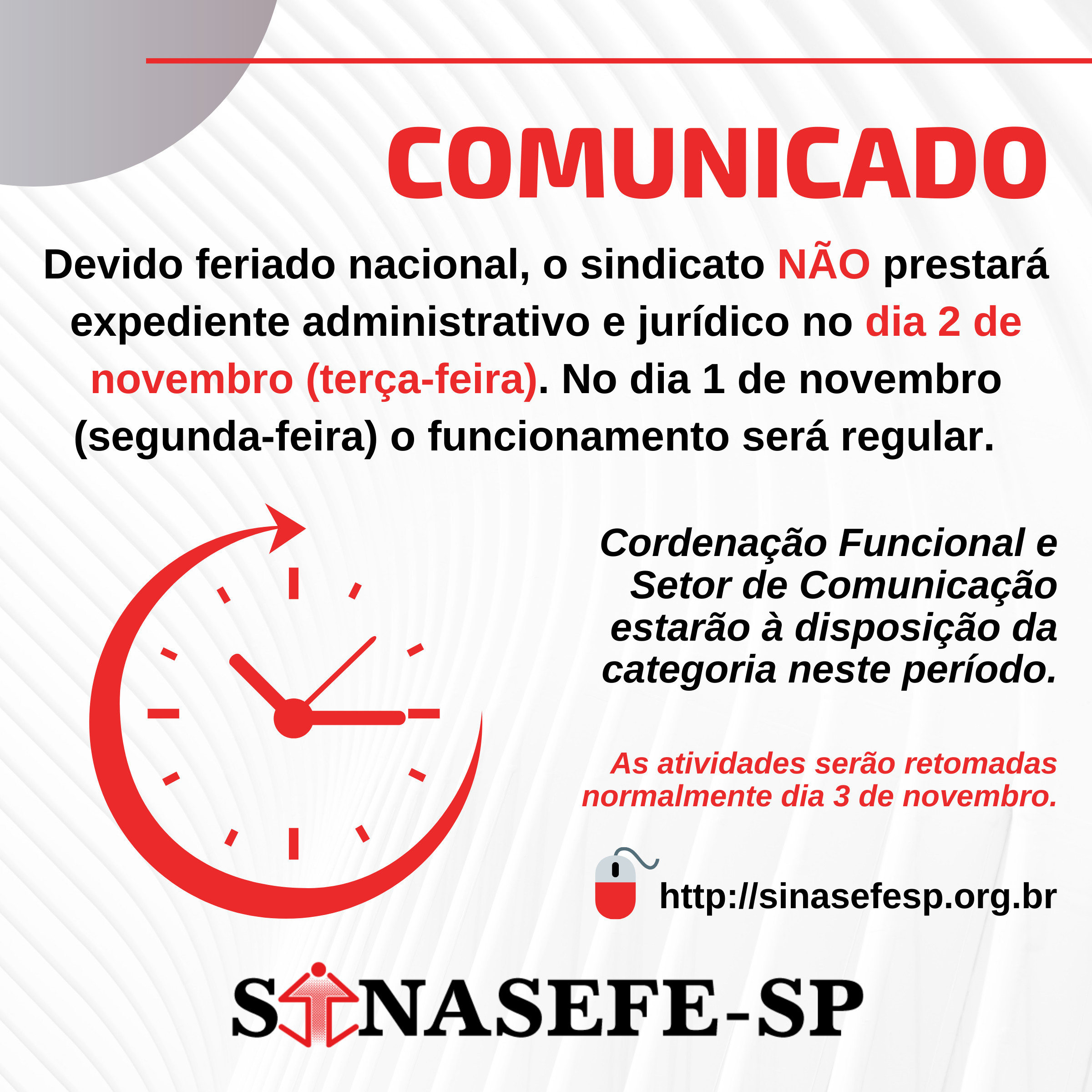 COMUNICADO: Devido feriado nacional, o sindicato NÃO prestará expediente administrativo e jurídico no dia 2 de novembro (terça-feira). No dia 1 de novembro (segunda-feira) o funcionamento será regular. Cordenação Funcional e Setor de Comunicação estarão à disposição da categoria neste período. As...