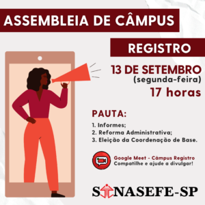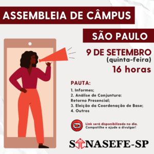 SÃO PAULO | ASSEMBLEIA DE CÂMPUS 🗓️ 9 de setembro (quinta-feira) 🕒 16 horas: PAUTA: 1. Informes; 2. Análise de conjuntura:retorno Presencial 3. Eleição da Coordenação de Base; 4. Outros 🎦 Link para participação na plataforma Zoom será disponibilizado no dia. 😉 Compartilhe e ajude a divulgar! 🖱️📑 SAIBA...