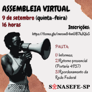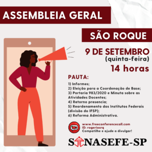 📢 Assembleia Geral Extraordinária do SINASEFE-SP Coordenação de Base São Roque 📍 Data: 09/09/2021 [quinta-feira] 🕒 Horário: 14h (segunda chamada às 14h15) ▶ Via online 🚩 Pauta: 1) Informes. 2) Eleição para a Coordenação de Base. 3) Portaria 983/2020 e Minuta sobre as Atividades Docentes. 4) Retorno...