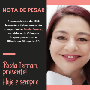⚫ NOTA DE PESAR | A comunidade acadêmica do Instituto Federal de São Paulo lamenta profundamente o falecimento da companheira PAULA FERRARI, servidora do Câmpus Itaquaquecetuba e filiada ao Sinasefe-SP. Expressamos nossa solidariedade aos familiares e amigos, além de nossos...
