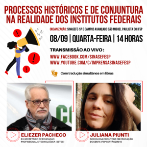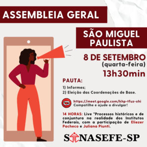 🚨📢 SÃO MIGUEL PAULISTA | ASSEMBLEIA GERAL 🗓️ 8 de setembro (quarta-feira) 🕜 13h30min: PAUTA: 1) Informes; 2) Eleição das Coordenações de Base ▶️ Link: https://meet.google.com/khp-tfuz-xhi 🕑 14 HORAS - LIVE PROCESSOS HISTÓRICOS E DE CONJUNTURA NA REALIDADE DOS INSTITUTOS FEDERAIS Palestrantes: 💬 Eliezer Pacheco: Foi titular da...