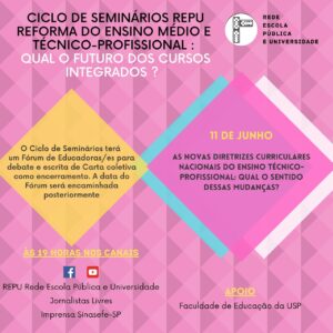 📢 Ciclo de Seminários REPU – Reforma do ensino médio e técnico-profissional: qual o futuro dos cursos integrados? 🗓️ No dia 11 de Junho, das 19h às 21h, o segundo seminário tem como discussão: Diretrizes curriculares nacionais do ensino médio...