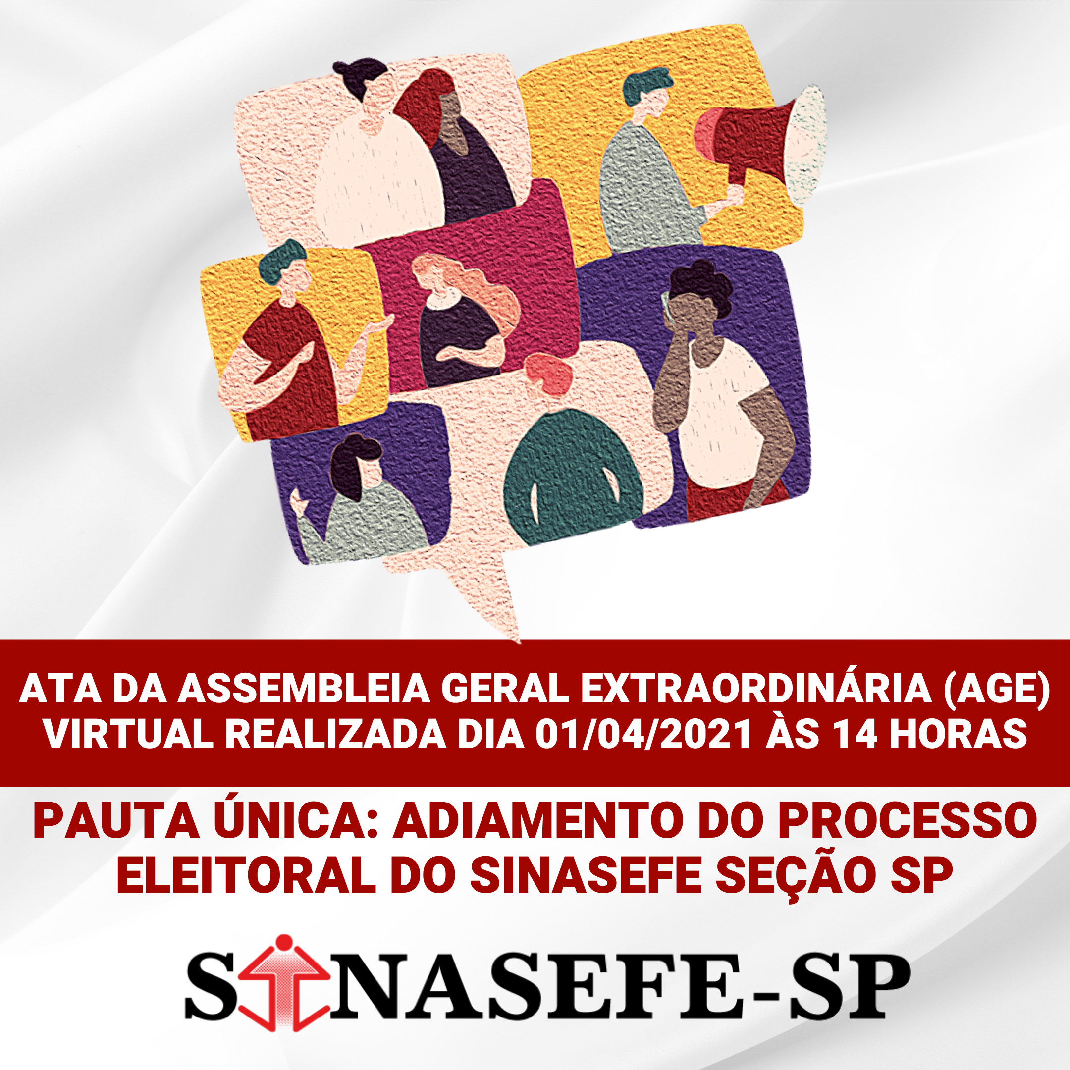 BAIXE AQUI EM FORMATO PDF: ATA AGE 01 DE ABRIL_ELEITORAL No dia 01 do mês de abril do ano de 2021, foi realizada Assembleia Geral Extraordinária do SINASEFE-SP, de modo virtual, através da plataforma Zoom,...