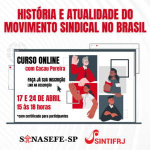 O SINTIFRJ e o Sinasefe-SP abrem inscrições para o Curso Online "História e Atualidade do Movimento Sindical no Brasil", com Cacau Pereira*, nos dias 17 e 24 de abril , das 15 às 18 horas através da Plataforma Zoom....