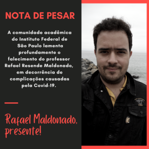 NOTA DE PESAR | A comunidade acadêmica do Instituto Federal de São Paulo lamenta profundamente o falecimento do professor Rafael Resende Maldonado, ocorrido neste sábado (03), em decorrência de complicações causadas pela Covid-19. Rafael era professor no Colégio Técnico de...