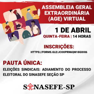 📢🚨 ATENÇÃO! DIA 1º DE ABRIL SERÃO REALIZADAS DUAS ASSEMBLEIAS VIRTUAIS: 🕓 14 HORAS: PAUTA ÚNICA: Adiamento do processo eleitoral do Sinasefe Seção SP Assembleia Geral Extraordinária (AGE) Virtual: 🕒 15 horas 🚩 PAUTA: 1) Campanha de vacinação do governo estadual e a inclusão dos...