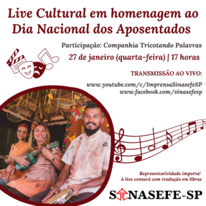 24 de janeiro é celebrado o Dia Nacional dos Aposentados. O Sinasefe-SP saúda todos(as) os nossos valorosos companheiros(as) pela luta, trabalho e vivência dedicados à construção de um país livre, democrático e socialmente justo. Em homenagem, vamos realizar uma...