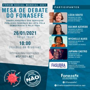 JORNADA DE LUTAS: Debate "Trabalhadores dos serviços públicos federais na luta pela democracia e pela vida" no Fórum Social Mundial 2021 O Fonasefe estará no Fórum Social Mundial 2021! Haverá uma mesa de debate para discutir as principais questões que...